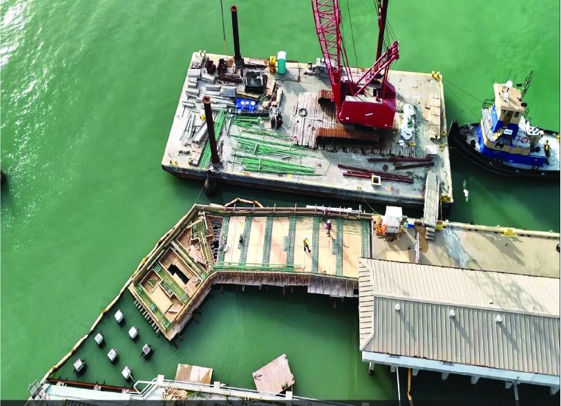 Work consisted of demolition of 2,560 sf of existing concrete pier ramp, removal of 22 existing timber fender piles, installation of 21 new timber fender piles and 64 conical pile covers. Designed and installed 28 structural cathodic protection pile jackets. Constructed 2,560 sf of new concrete pile caps, beams, and deck ( elevated ramp structure). Installed new fender cocks, wales, fenders, mooring hardware and guardrails. Installed 7 concrete pile jackets and 29 timber pile jackets. Repaired concrete pile caps / end beam spalls. Installed 69 new timber cross bracings. Repaired concrete under deck spalls, 144 lf of concrete slab joints, and 710 lf of full depth cracks in existing concrete deck.